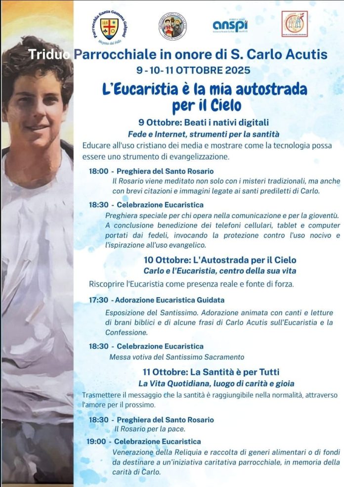 Da giovedì 9 a domenica 12 ottobre 2025, nella Parrocchia Santa Gemma Galgani di via Castelvetrano, a Mazara del Vallo, si terrà la prima Festa di San Carlo Acutis dopo la sua canonizzazione.Un appuntamento molto atteso dalla comunità parrocchiale, che da anni ha nel giovane santo milanese un modello di fede, entusiasmo e amore per l’Eucaristia.In questi giorni, la parrocchia vivrà un Triduo di preparazione dal tema “L’Eucaristia è la mia autostrada per il Cielo”, con momenti di preghiera, adorazione e riflessione, rivolti in particolare ai giovani e a quanti operano nella comunicazione e nel mondo digitale.Durante il Triduo saranno proposti il Rosario meditato, l’Adorazione Eucaristica guidata e la venerazione della reliquia del santo, insieme a una raccolta di generi alimentari e offerte destinate a un’iniziativa di carità parrocchiale in memoria della generosità di Carlo.La festa culminerà domenica 12 ottobre, giorno liturgico dedicato a San Carlo Acutis, con due celebrazioni nella chiesa parrocchiale di Santa Gemma: alle ore 11:00 la Solenne Celebrazione Eucaristica con l’atto di affidamento del nuovo anno pastorale al giovane santo; alle ore 19:00 la Celebrazione Eucaristica serale. La comunità vive questo momento nella gioiosa attesa del decreto che proclamerà ufficialmente San Carlo Acutis co-patrono della Parrocchia Santa Gemma Galgani. “San Carlo ci ricorda che la santità è possibile anche oggi, nella vita quotidiana, attraverso l’amore per Gesù Eucaristia e la carità verso gli altri” – ha sottolineato il parroco don Franco Geraldo Caruso.Un’occasione di fede e comunione per tutta Mazara del Vallo, che si stringe attorno al giovane santo dell’Eucaristia, testimone luminoso del Vangelo nel mondo digitale.