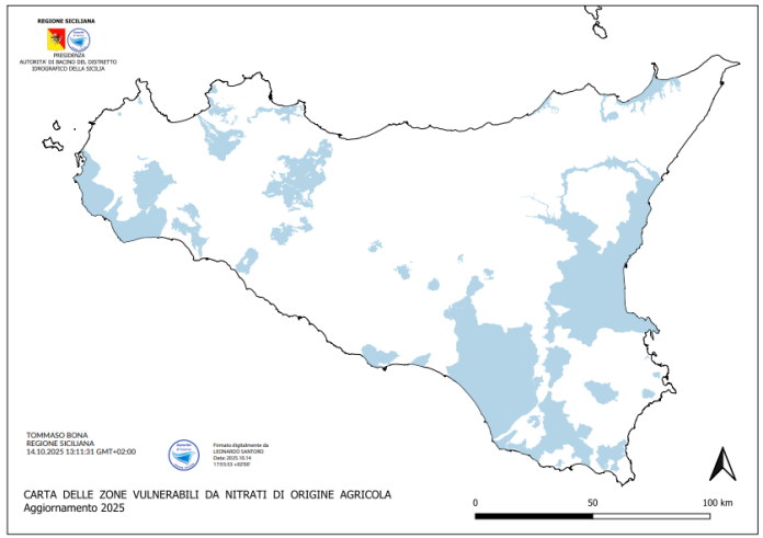 La Carta delle zone vulnerabili 2025 e la relazione tecnica di aggiornamento sono disponibili sul sito istituzionale dell’Autorità di bacino, con il decreto di adozione firmato dal segretario generale Leonardo Santoro. L’atto sarà pubblicato per estratto sulla Gazzetta Ufficiale della Regione Siciliana.