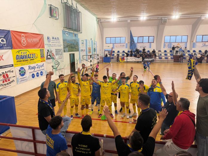 Primo successo stagionale per il Futsal Mazara che espugna il parquet di Regalbuto con il risultato di 2-4, in una gara che ha visto i gialloblu andare in vantaggio più volte e rispondere ai tentativi di rimonta dei padroni di casa.Prima occasione per i padroni di casa con Campagna, vola Danek. Poco dopo su schema da corner Capuano prova la botta al volo, palla di poco alta, mentre su un tentativo dello stesso numero 17 locale Danek si fa trovare pronto. I gialloblu rispondono con una ripartenza di Falasca che cerca l’imbucata per Joao, preso in controtempo. L’occasione più ghiotta arriva proprio con Falasca, lanciato a rete e a tu per tu col portiere avversario, ma il suo tentativo di dribbling si perde sul fondo. Mazaresi pericolosi anche con Joao, uno contro uno con Miraglia che però dice di no. Dall’altro lato, Danek è chiamato in causa prima da Timpanaro e poi da Campagna, opponendosi in entrambi i casi. Da un intercetto su corner, nasce il vantaggio gialloblu: Joao riparte ed evita Miraglia servendo Falasca che a porta vuota deve solo depositare in rete. La risposta dei locali arriva con Miraglia, che ci prova dalla distanza senza centrare la porta. Altro tentativo del Regalbuto con Vitale, mentre i gialloblu provano a sfruttare e gestire la situazione di vantaggio. I tentativi regalbutesi valgono il pari a 36 secondi dall’intervallo: Timpanaro buca la difesa gialloblu, mette in mezzo per Chiavetta che a porta praticamente sguarnita deve soltanto appoggiare per l’1-1. Mazara che ci riprova con De Marco e Rivella, ma si va al riposo su una situazione di equilibrio.Al rientro sul parquet, entrambe le squadre cercano di portarsi in avanti, il Regalbuto ci prova con una punizione di Capuano che viene deviata in corner. I gialloblu rispondono con una ripartenza di Falasca, chiuso però dallo stesso Capuano. Danek dice di no a una conclusione di Chiavetta dalla distanza, mentre poi è Miraglia a prendersi la scena, opponendosi a Bruno. La sfida si infiamma, il Regalbuto ci riprova con Ferrante, di poco fuori, mentre Joao orchestra una ripartenza pericolosa ma inefficace per il Futsal Mazara. Stesso copione qualche minuto più tardi, Joao sgroppa sulla fascia e prova la botta, esterno della rete. La formazione di mister Bruno prova ad alzare i ritmi e colleziona una tripla occasione su punizione di Rivella, con conclusioni in rapida successione dello stesso numero 10 e di Joao, ma il portiere locale si oppone. È però il preludio al nuovo vantaggio gialloblu, che arriva a 9’ dal termine del match con De Marco, letale in ripartenza. Padroni di casa che provano a reagire con il solito Capuano ma rischiano con una palla persa dal portiere senza che però il Mazara riesca ad approfittarne. La botta di Rivella su punizione si stampa sul palo, mentre poco dopo arriva il pari dei locali: Ferrante avanti per Capuano che anticipa Danek e fa 2-2. Gara che resta vivace con tentativi da una parte e dall’altra, per i mazaresi ci prova Bruno, per la formazione di Gamiddo è Campagna che non inquadra la porta. È però il Mazara che trova la forza di riportarsi avanti per la terza volta e lo fa con Joao che fa partire un destro potente, incrociando e facendo passare il pallone sotto le gambe di Miraglia. Regalbuto che a questo punto prova il tutto per tutto con il power play e per poco non rischia di incassare il poker su una palla persa. Nel finale è Danek che si oppone prima a Capuano e poi Campagna. Sul tentativo successivo, un pallone recuperato da Rivella a un secondo dalla fine porta al definitivo 2-4.