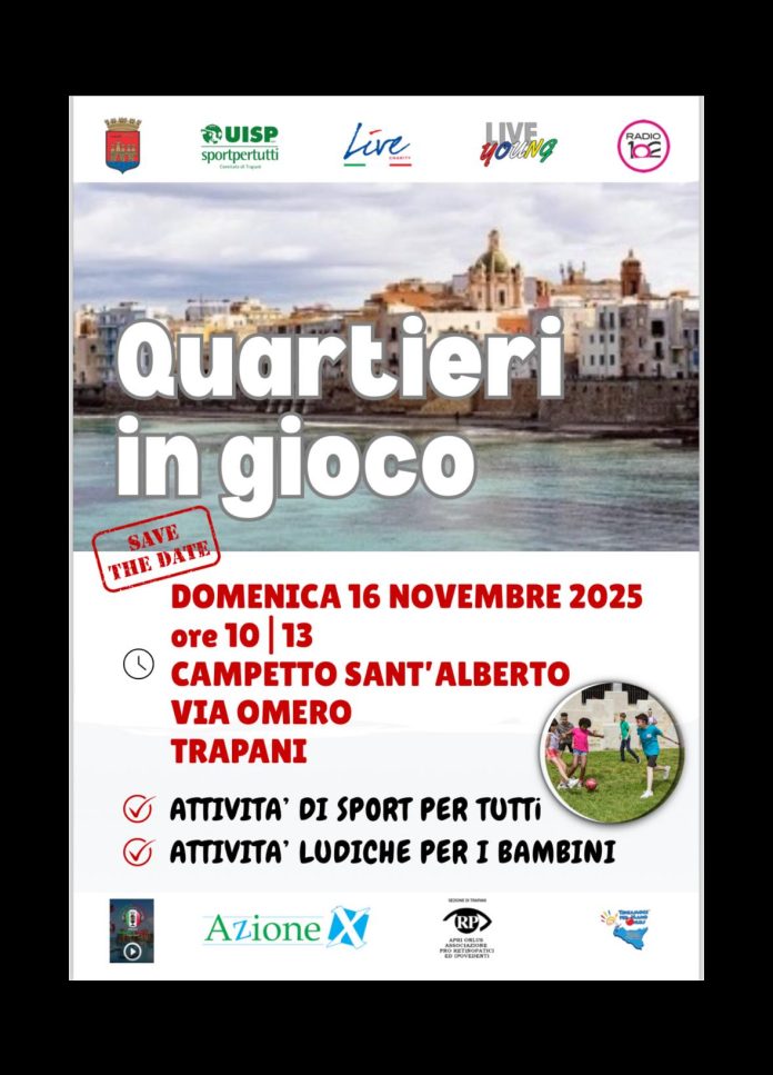 Domenica 16 novembre appuntamento per “Quartieri in Gioco”, una giornata di sport e divertimento per tutta la famiglia, dalle ore 10 alle 13, al Campetto Sant’Alberto di Via Omero a Trapani.