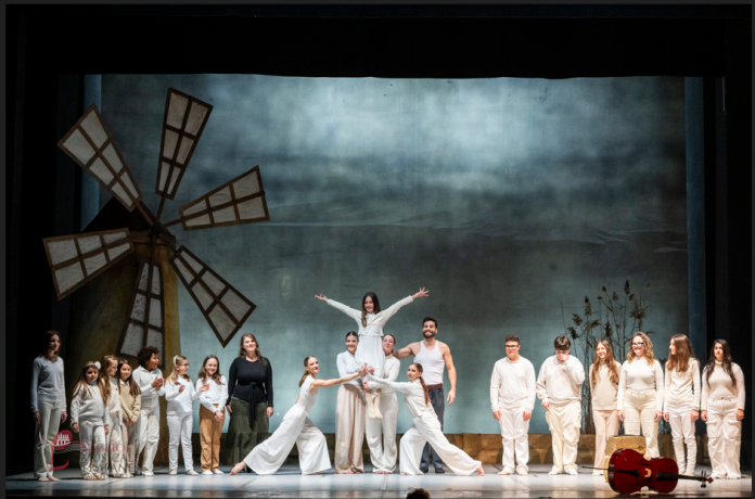 Il mulino a vento si staglia contro il cielo blu della scenografia, i riflessi del sale brillano sotto le luci del palco, una bambina stringe un violoncello. Al teatro Tonino Pardo è andata in scena “Il sogno di Azzurra”, l’opera in un atto di Andrea Ferrante inserita nel programma autunno – inverno della 77ª stagione dell’Ente Luglio Musicale Trapanese. Dopo “La ragazza imprudente” presentata in prima assoluta lo scorso ottobre, il Luglio Musicale Trapanese conferma la sua attenzione alla nuova produzione operistica contemporanea. Ambientata nelle saline trapanesi agli inizi del Novecento, l’opera racconta la storia di Azzurra – interpretata da Federica Pinco – che sogna di diventare musicista nonostante le difficoltà della vita e la chiusura del padre Salvatore, un salinaro consumato dalla fatica quotidiana. La regia di Enzo Caputo ha alternato la dimensione realistica del lavoro nelle saline con quella onirica degli Spiriti del Sale, incarnati dal Coro di voci bianche preparato da Anna Lisa Braschi. I giovanissimi coristi, vestiti di bianco, hanno popolato la scena con la loro presenza scenica, affiancati da giovani danzatrici che hanno completato il quadro visivo, creando un contrasto con i toni cupi della vita quotidiana dei salinari. Accanto alla protagonista, Giorgia Ferrara nei panni della madre Rosa e Mariano Orozco in quelli del padre hanno completato il nucleo familiare al centro della vicenda. Particolarmente suggestiva la scena del violoncello, momento di pura poesia musicale in cui la giovane interprete ha dato voce al sogno musicale di Azzurra. La scelta del Luglio Musicale Trapanese di affidare questa produzione a un cast di giovani e giovanissimi interpreti ha dato all’opera una freschezza particolare. I ragazzi del Coro di voci bianche hanno dimostrato preparazione e presenza scenica, mentre i solisti hanno sostenuto con sicurezza le loro parti vocali. La musica di Andrea Ferrante, diretta dal Maestro Mirco Reina, ha accompagnato il viaggio emotivo dei personaggi dalla fatica alla speranza. La partitura ha alternato momenti lirici a sequenze corali, evocando ora il ritmo del lavoro nelle saline, ora la leggerezza dei sogni. L’allestimento scenografico ha puntato sull’essenzialità, affidando alla luce il compito di segnare i passaggi emotivi della storia: dai toni freddi e lunari delle scene notturne ai bagliori caldi del finale. Al termine dello spettacolo, il pubblico ha applaudito il cast completo. “Il sogno di Azzurra” rappresenta un tributo al paesaggio e alla cultura delle saline trapanesi, trasformando un elemento identitario del territorio in materia di racconto operistico e offrendo al contempo un’importante opportunità formativa per i giovani talenti.