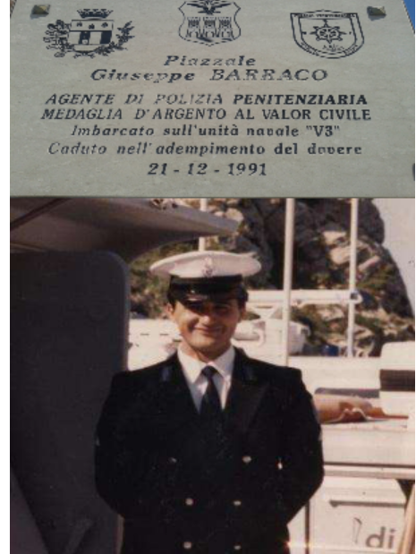 Giuseppe Barraco era un Agente della Polizia Penitenziaria in servizio sull’isola. Il 21 dicembre 1991, nonostante non fosse in servizio, scelse di aiutare i colleghi per mettere in sicurezza una motovedetta del Corpo durante una violenta tempesta. In quel gesto di estremo altruismo, Giuseppe perse la vita. Il suo eroismo è stato riconosciuto nel 1992 con il conferimento della Medaglia d’Argento al Merito Civile alla memoria. Oggi, il suo nome è inciso nel cuore dell’isola: a lui sono intitolati la Casa di Reclusione, una piazza di Favignana e l’unità navale V.3 della Polizia Penitenziaria.