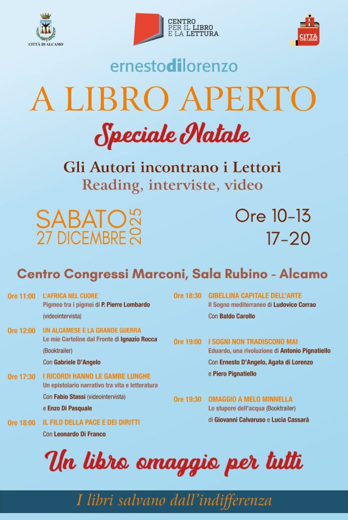 Il prossimo 27 dicembre, presso la Sala Rubino del Centro Congressi Marconi, una nuova edizione, dopo quella del mese di maggio, di “A LIBRO APERTO”, promossa da Ernesto Di Lorenzo editore, in collaborazione con il Comune di “Alcamo Città che Legge” e con il Centro per il Libro e la Lettura (CEPELL). L’appuntamento culturale è inserito nel cartellone del Natale alcamese e prevede dalle ore 10 alle ore 20 incontri con gli autori, proiezioni di videointerviste e booktrailer e l’esposizione di tutti i titoli del catalogo con una promozione natalizia dedicata a tutti i visitatori. Chi parteciperà alla giornata, potrà incontrare gli autori dei libri, conoscere i testi e prendere parte ai dibattiti, ‘A libro aperto’, infatti, vuol essere un invito alla lettura, al dialogo, allo scambio di idee su tematiche importanti, un momento di riflessione dove ognuno potrà ritrovarsi e scegliere ciò che lo interessa e lo coinvolge di più. Un appuntamento interessante ed originale che prevede, mattina e pomeriggio, incontri a tema con gli autori dei libri editi da ‘Ernesto Di Lorenzo Editore’ e non solo, per sottolineare l’insostituibile valore della lettura come strumento che stimola il pensiero: una palestra mentale in grado di condurre i lettori oltre la superficie delle cose, facendo sviluppare consapevolezza e senso critico.