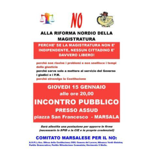 La mobilitazione contro la Riforma Nordio non si ferma e fa tappa a Marsala. Il Comitato Marsalese per il NO, composto da una vasta rete di forze civiche, sindacali e politiche (ANPI, Ass. Difesa Costituzione, CGIL, AVS, M5S, Rifondazione Comunista e PD), ha annunciato un nuovo appuntamento cruciale per la cittadinanza.