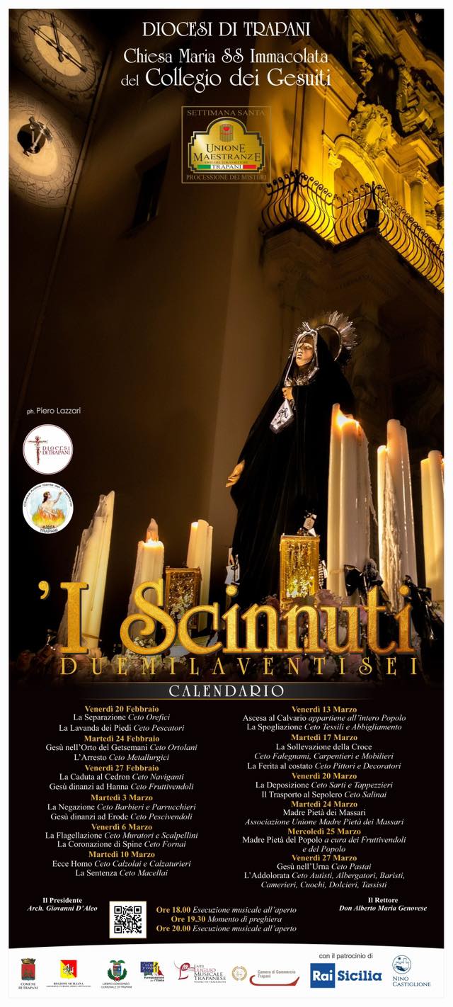 Con la celebrazione del rito delle “sacre ceneri” mercoledì 18 febbraio inizia il tempo “forte” di Quaresima a Trapani caratterizzato dalla celebrazione dei riti antichissimi i “scinnuti” o “scinnute” dei sacri gruppi dei Misteri della processione del Venerdì Santo, riti che vedono protagonisti tutti i ceti ogni martedì e venerdì a partire da venerdì 20 febbraio p.v. nella Chiesa del Collegio. “Il nostro cammino inizia già alle Ceneri che condivideremo insieme al vescovo alla Celebrazione Eucaristica in Cattedrale – dice don Alberto Genovese rettore della Chiesa del Purgatorio, parroco della Cattedrale e vicario generale  – Quest’anno vivremo i riti quaresimali nella Chiesa del Collegio che ospita temporaneamente i gruppi sacri. Lo faremo intensamente, approfondendo tutta la passione di Cristo attraverso il percorso che i nostri padri ci hanno tramandato con queste meravigliose realizzazioni dell’artigianato artistico trapanese.  Come sempre attraverso la dedizione dei ceti, i gesti di carità, la musica ogni gesto si farà preghiera e silenzio con cui si innalza la fede e la devozione dell’intero popolo trapanese”. Un Messaggio di identità e fede condiviso dall’Unione Maestranze .”Vogliamo che la Chiesa del Collegio diventi quest’anno la casa di ogni trapanese. – afferma in una nota il presidente Giovanni D’Aleo – Comunicare questi riti significa tramandare un battito cardiaco che non si è mai fermato. Invitiamo tutti a vivere questi momenti con il rispetto che si deve al sacro e il pathos che solo la nostra terra sa generare”.