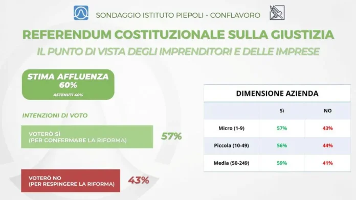ROMA (ITALPRESS) – Il 94% degli imprenditori intervistati è a conoscenza del fatto che il 22 e il 23 marzo si svolgerà il referendum confermativo sulla riforma della giustizia e 9 intervistati su 10 sanno che non è previsto il quorum. Il 90%, invece, è informato sull’esistenza e sui contenuti della Legge di riforma costituzionale, oggetto della consultazione referendaria. E’ quanto emerge dal sondaggio che l’Istituto Piepoli, in collaborazione con Conflavoro, ha realizzato in occasione del referendum sulla giustizia, previsto per il 22 e 23 marzo 2026. L’indagine ha coinvolto un campione di imprenditori e piccole e medie imprese, rappresentativo per Grande Ripartizione Geografica (GRG) e ampiezza dei centri abitati, con 500 interviste distribuite tra liberi professionisti, lavoratori autonomi, negozianti, commercianti, artigiani, agenti di commercio e agricoltori.