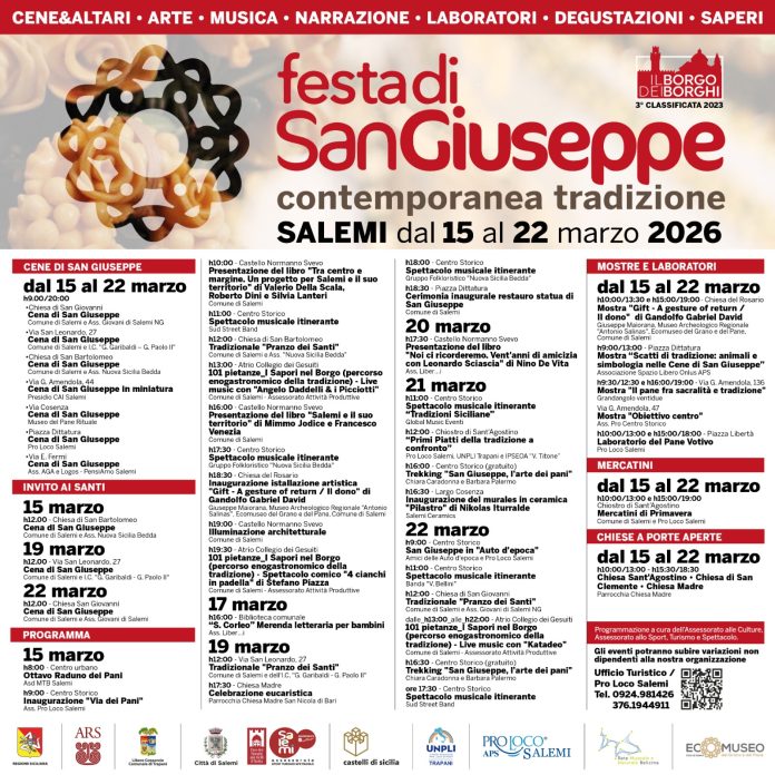 Tornano a Salemi le tradizionali Cene e gli altari di San Giuseppe, insieme a mostre, musica e numerosi eventi culturali. Dal 15 al 22 marzo la città ospiterà la “Festa di San Giuseppe – Contemporanea Tradizione”, otto giorni dedicati alla devozione popolare, alla cultura e alla valorizzazione del centro storico di uno dei Borghi più belli d’Italia. Protagonisti saranno i tradizionali altari di pane e le Cene di San Giuseppe, insieme a mostre, musica e tanti appuntamenti che animeranno il centro storico della cittadina in provincia di Trapani. Il programma è stato elaborato dall’Amministrazione Comunale, guidata dal sindaco Vito Scalisi, tramite l’Assessorato al Turismo diretto da Pietro Crimi, con il contributo della Pro Loco, dell’I.C. “G. Garibaldi – G. Paolo II”, delle associazioni locali e dei cittadini.
