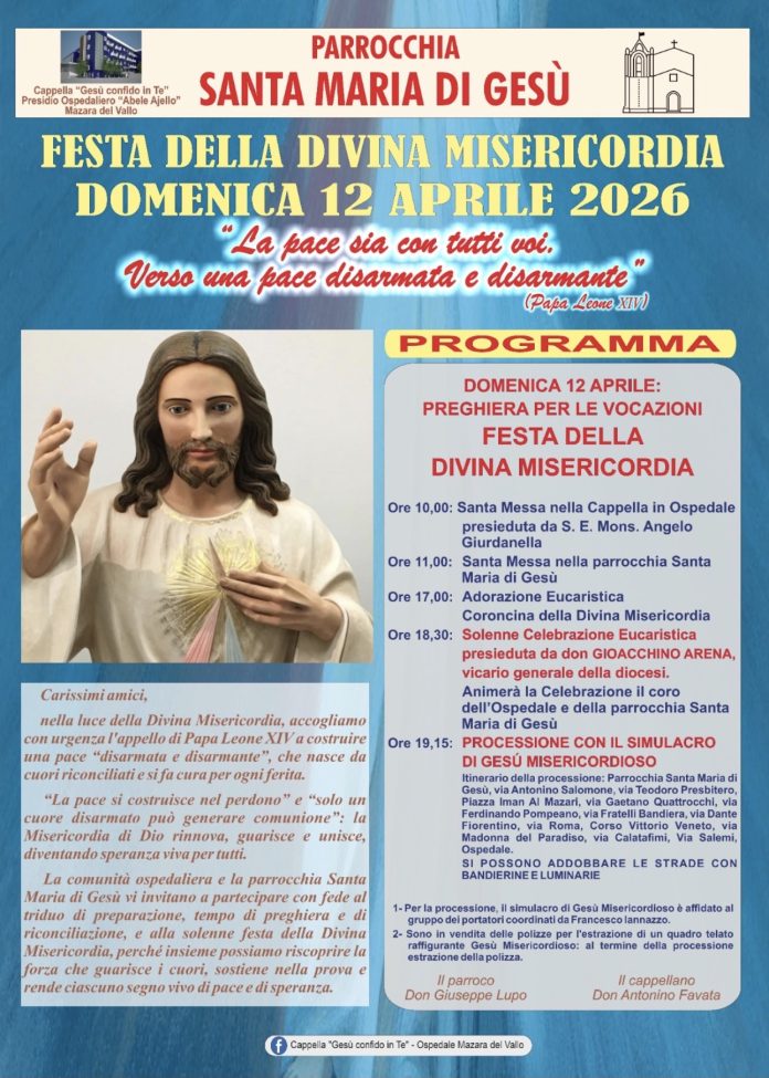 La città di Mazara del Vallo si appresta a vivere la Domenica della Divina Misericordia, una ricorrenza che quest’anno, tra le navate delle chiese e i corridoi dell’ospedale, risuona con un urgenza particolare: la ricerca della pace. Come ricordava Santa Faustina Kowalska, “l’umanità non troverà pace finché non si rivolgerà con fiducia alla Divina Misericordia”, e proprio su questo solco si muove il programma pastorale coordinato da Don Antonino Favata Cappellano del Presidio Ospedaliero di Mazara del Vallo