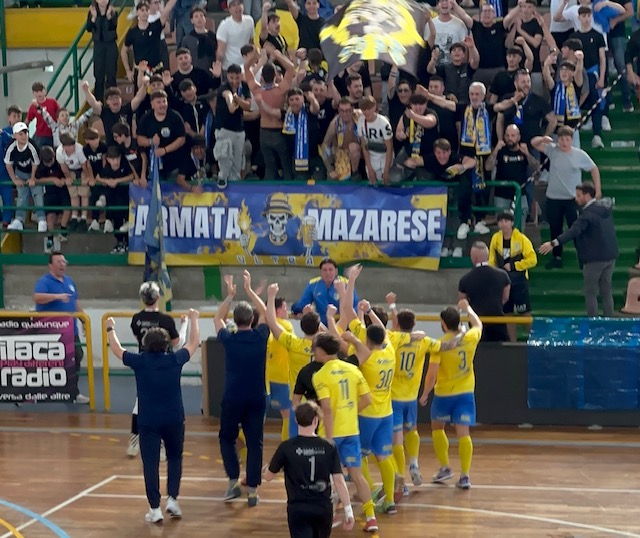 Sconfitta dal retrogusto dolce per il Futsal Mazara che cade per 4-3 a Marsala nel ritorno dei quarti di finale dei play off di Serie A2, ma stacca comunque il pass per le semifinali in virtù del largo successo (4-1) della gara d’andata. Prossimo avversario dei gialloblu sarà l’Eur, con gara d’andata a Roma sabato 25 aprile e gara di ritorno in casa sabato 2 maggio. I padroni di casa partono forte, visto anche lo svantaggio da recuperare, ma il sinistro di capitan Patti finisce largo. Per i gialloblu ci prova Rivella, con Cosenza che si fa trovare pronto. Il risultato si sblocca dopo 4’18’’ quando un pallone viene messo in mezzo e De Bartoli devia in rete sottoporta. I mazaresi provano a reagire con capitan Felipe Alves, mentre dall’altro lato Danek salva i suoi a tu per tu con Foderà. I gialloblu cominciano ad affacciarsi in avanti in modo più aggressivo, prima con Joao e poi con Di Conto, ma dopo poco meno di 11’ sono già a quota cinque falli. Nonostante questo, la squadra di mister Bruno va vicina al pari: Buscaglia vince un rimpallo e ci prova, poi Joao non arriva a correggere in rete per un soffio. Un paio di minuti più tardi però il Marsala trova il raddoppio con Foderà, il cui destro si insacca sul secondo palo. La reazione mazarese è immediata, filtrante per Bruno che ancora una volta si conferma letale in zona gol e batte Cosenza con un diagonale preciso. Occasioni da una parte e dall’altra, prima Tendero manda di poco fuori, poi i mazaresi vanno a un passo dal pari con il duo Alves-Joao, ma i padroni di casa si salvano in qualche modo e così si va al riposo sul 2-1. In avvio di ripresa, dopo poco più di due minuti, il Marsala torna sul +2 con De Bartoli che in area si gira e segna. Anche in questo caso la reazione del Futsal Mazara è immediata, con Joao che va a segno, ma la direzione di gara annulla per un fallo subito in precedenza senza applicare la norma del vantaggio. Fase di sofferenza per la formazione di mister Bruno che rischia ma resiste sui tentativi di Barroso, Patti (che colpisce il palo) e De Bartoli. I gialloblu riprendono vigore e si riaffacciano in avanti con Daricca che ha l’occasione di calciare ma preferisce servire in mezzo Alves, anticipato in corner da Bonafede. E proprio sul calcio d’angolo, al 9’, i gialloblu accorciano: battuta di Daricca, il pallone arriva a Felipe Alves che da due passi deve solo appoggiare in rete per il 3-2. Quattro minuti dopo però il Marsala ritrova il doppio vantaggio con un’azione di Tendero che scappa a destra e in diagonale batte Danek. I mazaresi però rispondono, prima sull’asse Bruno-Alves, con Cosenza che si salva in corner e poi, allo scoccare del 15’, con Bruno che scappa e subisce fallo da Patti: secondo giallo per lui e Marsala in inferiorità. E proprio nei secondi successivi il Futsal Mazara accorcia nuovamente, con un’azione insistita di Joao che prima trova l’opposizione di Cosenza e poi gli fa passare il pallone sotto le gambe per il 4-3. Gol che suona come una doccia gelata per la squadra di casa, che ci prova con il power play ma rischia di subire il pari ancora con Joao, che ci prova dalla propria metà campo (De Bartoli di testa mette in corner in ripiegamento difensivo). Poi è sempre il brasiliano che gestisce l’ultimo possesso e va vicino al pari, ma la sirena dice che è tutto. Il Futsal Mazara passa il turno e stacca il biglietto per le semifinali play off.