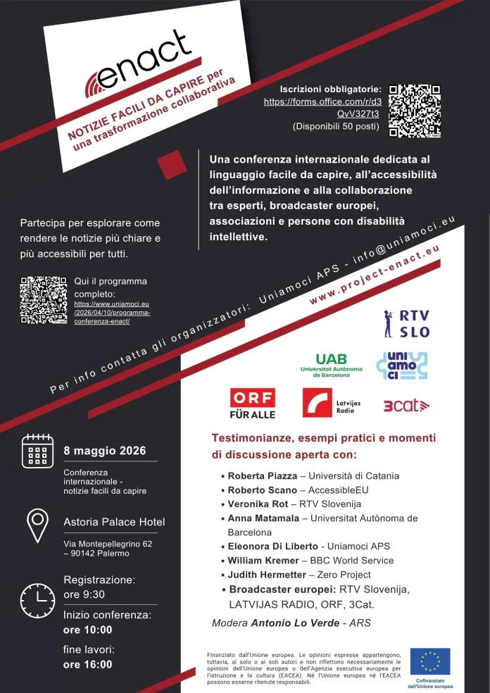 Esperti di accessibilità, accademici, broadcaster europei, rappresentanti istituzionali e organizzazioni della società civile si riuniranno a Palermo per una conferenza internazionale, organizzata nell’ambito del progetto europeo ENACT, dal titolo “Notizie facili da capire per una trasformazione collaborativa”. L’evento si terrà venerdì 8 maggio 2026 dalle 9.30, presso l’Astoria Palace Hotel di Palermo (Via Montepellegrino 62). Saranno presenti i broadcaster europei BBC, RTV Slovenija, LATVIJAS RADIO, Austrian Broadcasting Corporation (ORF) e Corporació Catalana de Mitjans Audiovisuals – 3Cat. I lavori prevedono sessioni tematiche dedicate all’accessibilità dell’informazione, testimonianze dirette, dimostrazioni di formati informativi accessibili e uno spazio di confronto aperto nel pomeriggio. L’obiettivo è promuovere una cultura dell’informazione più inclusiva, partecipata e attenta ai bisogni di tutti. Per tutta la durata dei lavori sarà disponibile un servizio di traduzione simultanea italiano–inglese. Tra gli interventi confermati quello di Roberta Piazza dell’Università di Catania, Roberto Scano, AccessibleEU, Veronika Rot di RTV Slovenija, Anna Matamala dell’Universitat Autònoma de Barcelona, Eleonora Di Liberto di Uniamoci APS, William Kremer della BBC World Service e Judith Hermetter – Zero Project. La conferenza ha ottenuto il patrocinio dell’Ordine dei giornalisti di Sicilia. Il progetto europeo Enact, che qui in Sicilia ha come partner l’associazione palermitana Uniamoci aps, va avanti da Maggio 2025 e si concluderà a Novembre 2026. L’acronimo ENACT è composto dalle iniziali di Easy-to-Understand News for Collaborative Transformation ed è una rete dell’Unione Europea che rende le notizie più facili da capire sul web, alla radio e alla TV. Riunisce partner provenienti da tutto il continente. Il team è formato da giornalisti, esperti di media, specialisti linguistici, professionisti della tecnologia e persone che leggono, guardano o ascoltano le notizie.”Il progetto ha diversi obiettivi – spiega Elenora Di Liberto di Uniamoci aps. In primo luogo, forma gli operatori dei media a creare notizie facili e chiare attraverso speciali programmi di formazione e scambio. Aiuta anche i professionisti di diversi paesi a condividere idee e lavorare insieme. In secondo luogo – prosegue Di Liberto – il progetto testa diversi modi per semplificare notizie complesse e trova i metodi migliori con l’aiuto degli utenti. E crea le regole per dare le notizie con un linguaggio di facile comprensione. Il progetto avrà anche un sito online per condividere buone pratiche. Un altro obiettivo – conclude la vice presidente di Uniamoci aps – è quello di coinvolgere le persone nel processo, incoraggiandole a partecipare e aiutandole a comprendere meglio le notizie”.