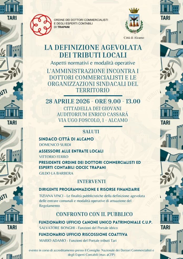 Martedì prossimo 28 aprile, a partire dalle 9.00, alla Cittadella dei Giovani, ci sarà un incontro pubblico sulla Definizione Agevolata dei Tributi Locali, aspetti normativi e modalità operative. L’incontro, organizzato dall’Amministrazione, è rivolto ai dottori commercialisti e alle organizzazioni sindacali del territorio e prevede, dopo i saluti istituzionali del Sindaco Domenico Surdi, dell’assessore alle entrate locali Vittorio Ferro e del Presidente dell’Ordine dei dottori commercialisti ed esperti contabili ODCEC Trapani, Gildo La Barbera, gli interventi della dirigente della programmazione e risorse finanziarie Tiziana Vinci e dei funzionari Salvatore Bonghi e Mario Adamo. Dichiara l’assessore Vittorio Ferro: “abbiamo voluto quest’incontro pubblico, aperto a chiunque volesse partecipare insieme ai commercialisti e ai sindacati, per approfondire e confrontarci sulle modalità operative del Regolamento e sul funzionamento dello Sportello telematico, oltre che parlare del Portale Idrico e del Portale Tributi TARI. Auspichiamo che la mattinata possa essere utile per chiarire e risolvere tutte gli eventuali dubbi e perplessità che possano derivare dall’applicazione del Nuovo Regolamento per la definizione agevolata delle entrate comunali non riscosse a seguito di ingiunzioni di pagamento e accertamenti esecutivi (c.d. “rottamazione-quinquies”), legge 30 dicembre 2025, n. 199”.
